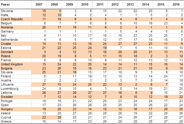 La Slovenia recupera 5 posizioni e si pone al primo posto della graduatoria rispetto al punteggio conseguito (tavola 4). Nel 2016 si nota un recupero di molti Paesi dell’Eurozona, con un sostanziale riequilibrio rispetto agli altri non appartenenti all’area dell’euro (Romania, Polonia, Bulgaria e Ungheria).