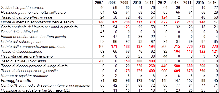Nel 2016 gli squilibri macroeconomici si sono ridotti notevolmente, con 26 Paesi su 29 in fascia verde e 2 soli in fascia rossa (Grecia e Cipro), facendo registrare il valore medio più basso del decennio: era 94 nel 2007, salito fino a 145 nel 2011, per poi ridursi a 69 nel 2015 e 58 nel 2016. Negli ultimi due anni un miglioramento si è registrato soprattutto nella quota di mercato delle esportazioni e nella riduzione della disoccupazione giovanile e di lungo periodo.