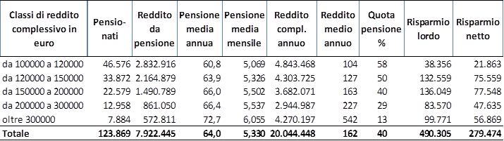 I pensionati che hanno un reddito complessivo superiore ai 100 mila euro erano 123.869, con un reddito totale di 20 miliardi di euro (il reddito medio è di 162 mila euro). I più ricchi, quelli con un reddito annuale superiore ai 300 mila euro erano 7.884 (il reddito medio è di 542 mila euro).
