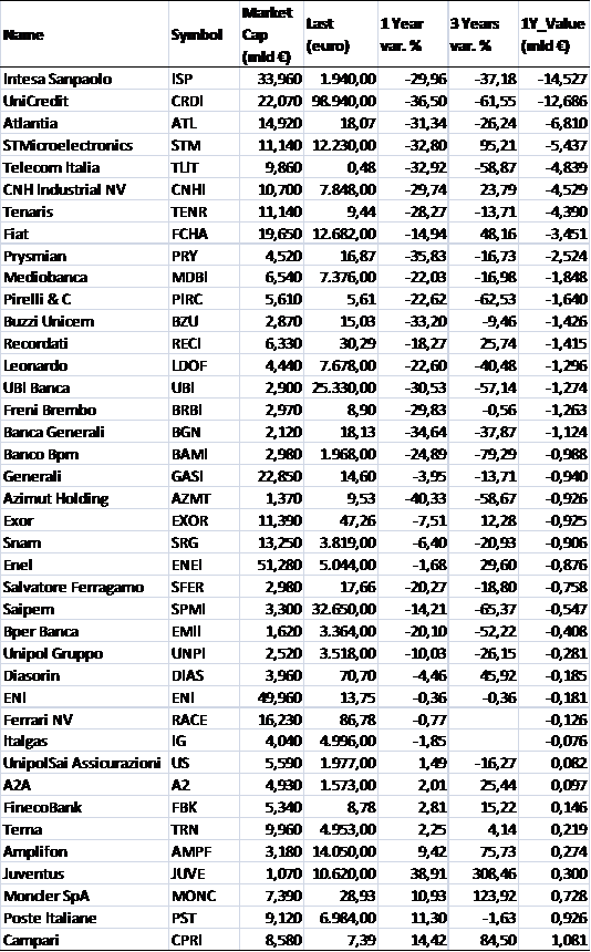 Nonostante il clima sfavorevole alcune società sono riuscite ad aumentare il valore dei propri titoli e nell’ordine di incremento della capitalizzazione sono Campari, Poste italiane, Moncler, Juventus, Amplifon, Terna, Fineco Bank, A2A e UnipolSai Assicurazioni.