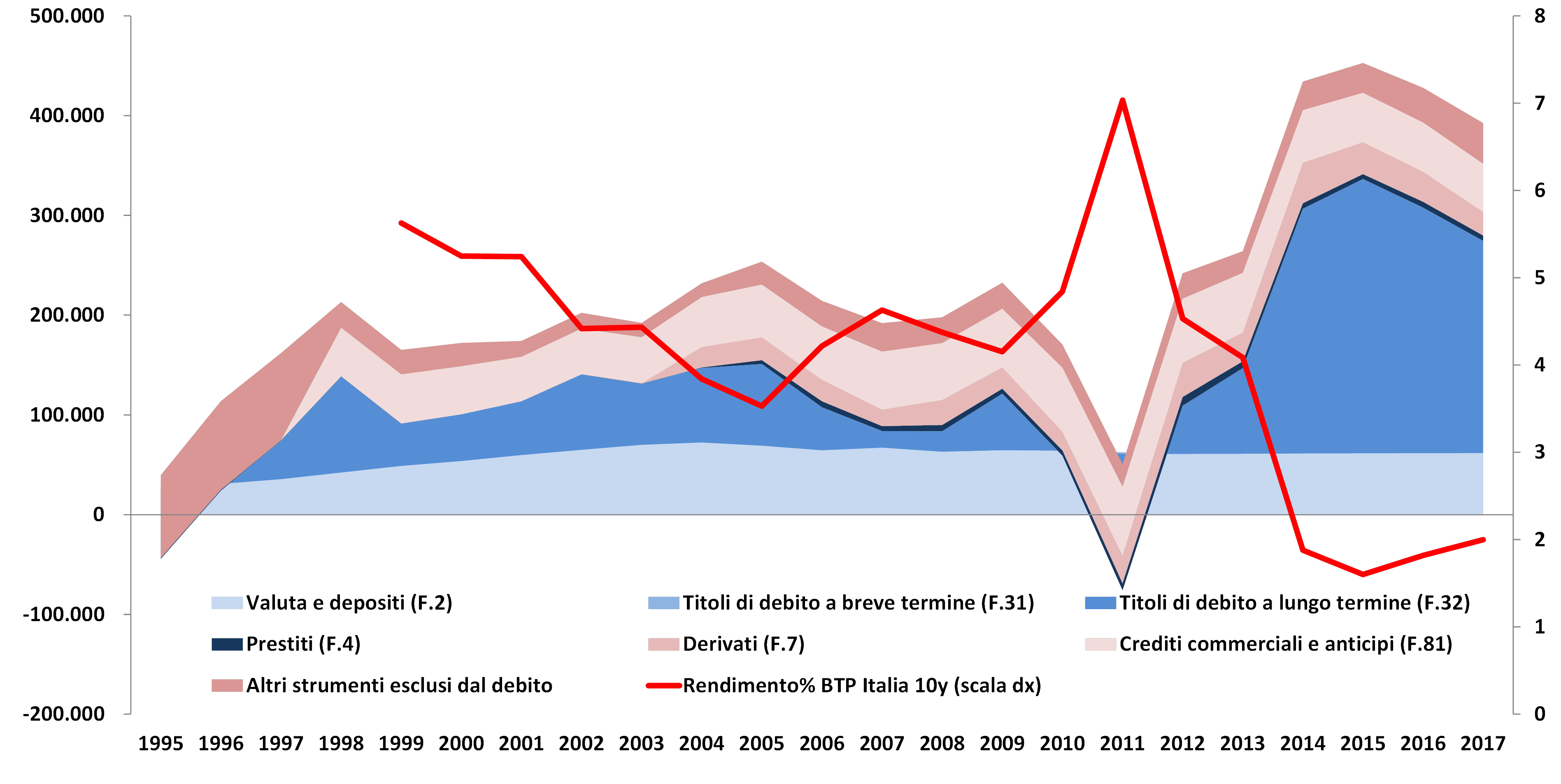 Figura 1 – Differenze tra le passività finanziarie e il debito pubblico per strumento finanziario e tasso di rendimento dei BTP decennali, anni 1995 – 2017 (scala sinistra milioni di euro, scala destra valore percentuale)