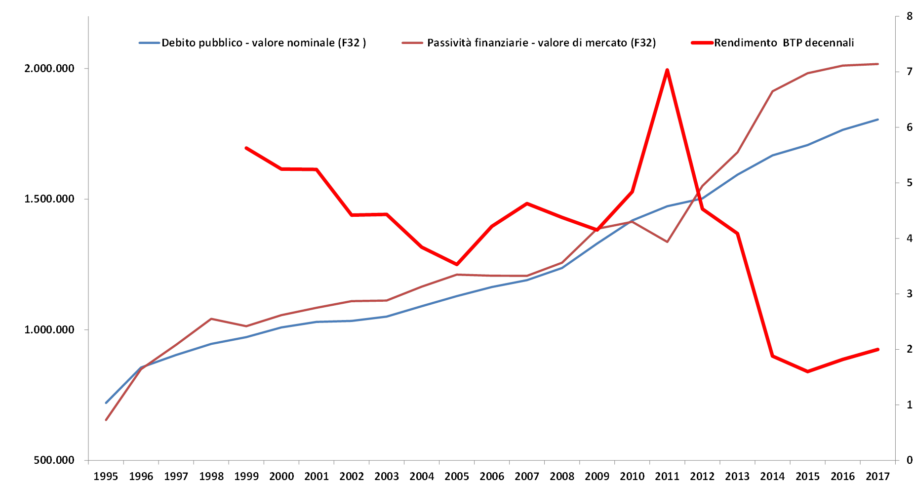 Figura 2 – Stock di debito pubblico e passività finanziarie per i titoli a medio e lungo termine (F32) e tasso di rendimento dei BTP decennali, anni 1995 – 2017 (scala sinistra milioni di euro, scala destra valore percentuale)