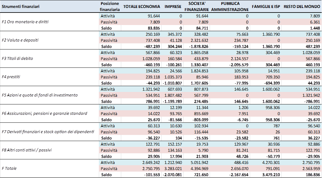 [3] Oro monetario e diritti speciali di prelievo (F.1), Biglietti, monete e depositi (F.2),Titoli (F.3), Prestiti (F.4), Azioni, partecipazioni e quote di fondi (F.5), Riserve assicurative e pensionistiche e garanzie standard (F.6), Derivati finanziari e stock option di dipendenti (F.7), Altri conti attivi e passivi (F.8)